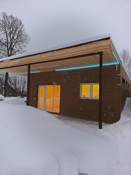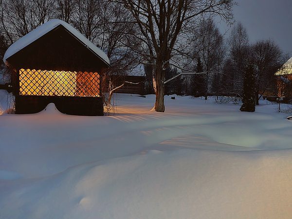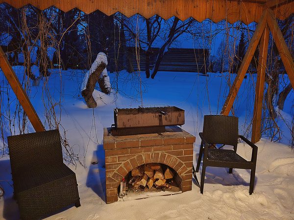 Снаружи — лес и пруд рядом (зимой превращается в купель). Для ужина на свежем воздухе — беседка с грилем.
