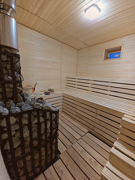 Большая парилка на 6 мест с качественной каменкой, просторная зона отдыха, лес вокруг и пруд рядом (зимой — купель). На участке — оборудованная беседка для гриля. Можно приезжать с домашними животными.